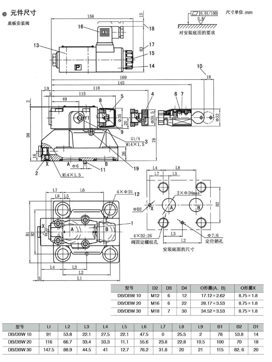 用于底板安裝,安裝面按DIN24340 E型,ISO 6264和CETOP-RP 121 H,用于螺紋連接,用于油路塊安裝。4種調整元件:①旋鈕②帶護罩的調節螺栓③帶刻度的有鎖旋鈕④帶刻度旋鈕。5種設定壓力,借助于安裝在其上的電磁方向閥操作卸荷。可選的切換時間延遲(僅DBW型)。
