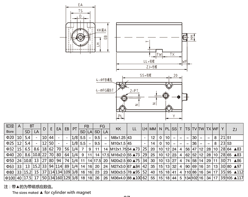 薄型油缸LA型徑向安裝(單軸)外形安裝尺寸圖